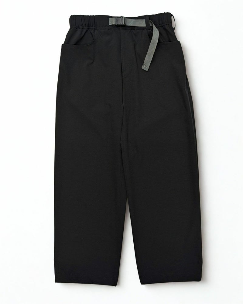 ワイドシルエットながら細部まで計算された現代的なシルエットバランス。ウェビングベルトには、職人の手によるカゴ染めで色ムラを出したオリジナルナイロンテープを使用している。