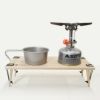 ガス缶を地面や雪面に直置きするより缶自体の冷え防止し、平面に安定して置く事ができ缶が溝に引っかかり横ズレしにくいという利点もあります。