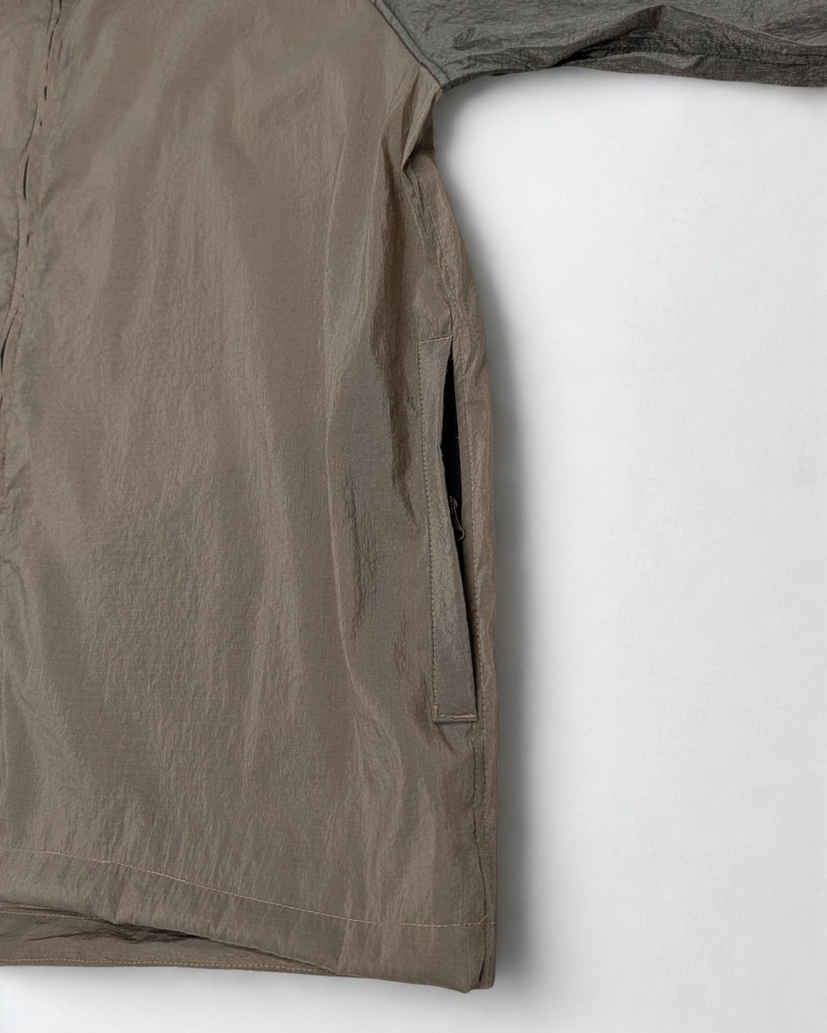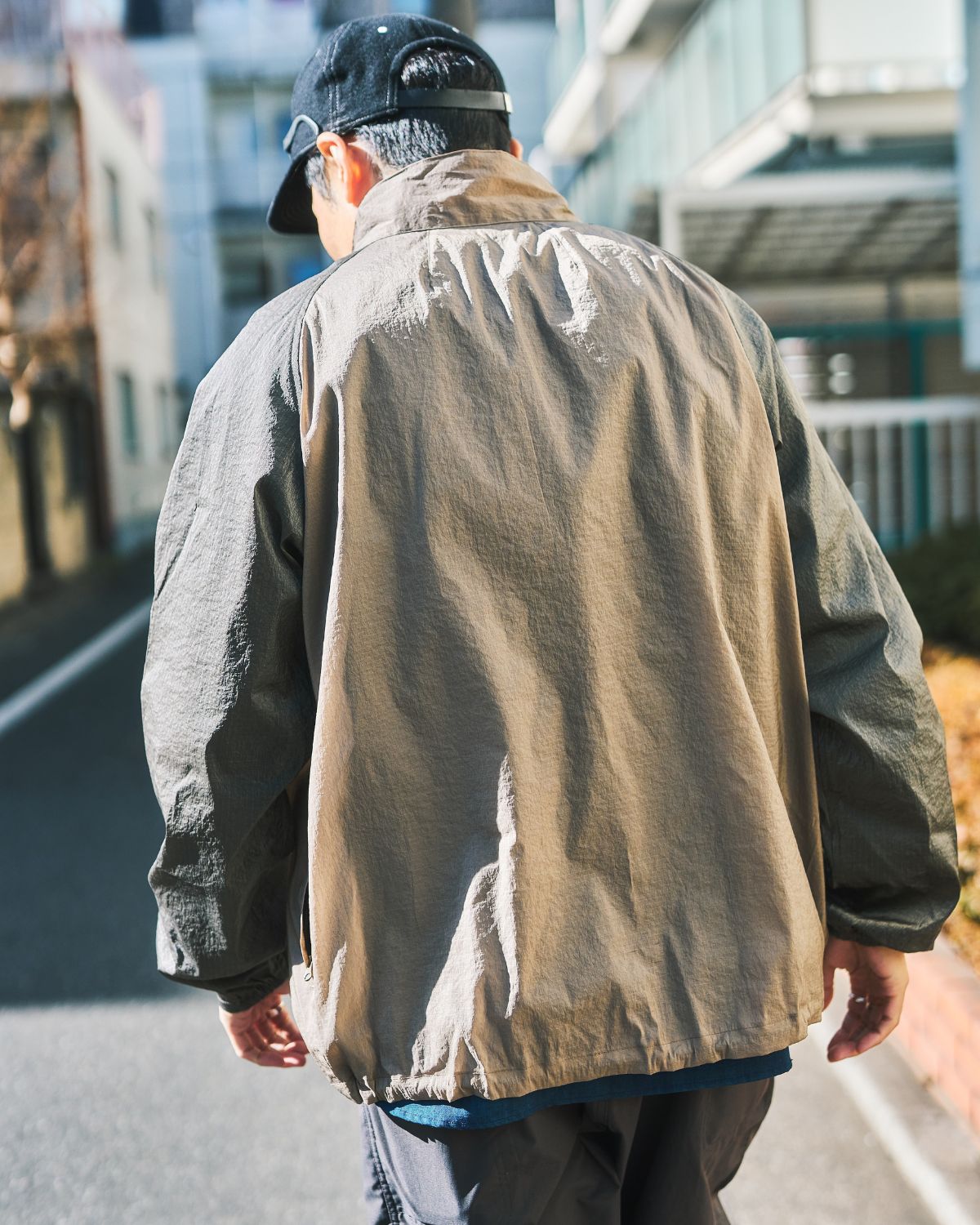 メタリックな質感と反射光が印象的な、シャイニーリップストップ生地を採用。薄く軽量なナイロンを裏地なしの一枚で仕立てることで、圧倒的な軽やかさを実現。